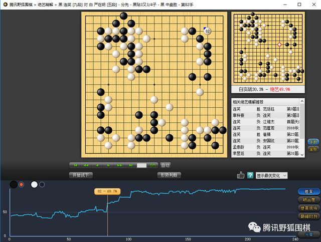 陈耀烨在右边盘也一时找不到好的入局之机,只能回到左上角安置数颗孤子。优势心理下,周睿羊有两手棋过于松懈,大度地“驱赶”白棋回家,而自身所得有限,腾讯野狐围棋网上的超级AI绝艺判断,黑棋这两手棋合计让胜率崩掉65个百分点。