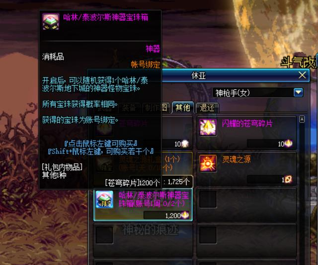 这个哈林/泰波尔斯宝珠箱子,一个售价为1200个苍穹碎片,同时一个账号一周只能购买二个,也就是2400个碎片。