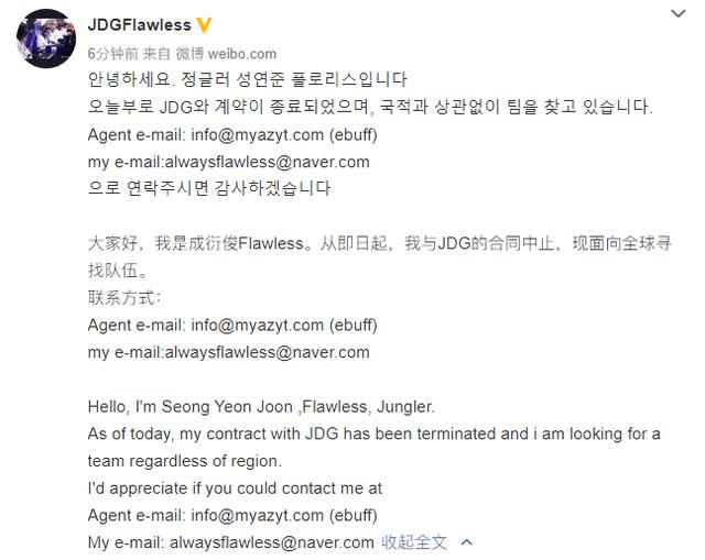 刚刚JDG前打野选手Flawless发博,表示他与JDG的合同到期,目前在全球范围内寻找队伍。