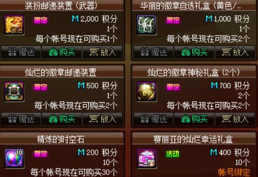 最新的魔盒更名为苍骨墨香毛笔礼盒,限时加入灿烂的徽章神秘礼盒(4个)以及白金徽章礼盒(1个),虽然开出的魔盒能够交易一次,但是都是随机的徽章,对于脸黑玩家来说还是比较坑的。其实早期DNF的魔盒也是加入过白金徽章,并且还是自选的,当初拍拍卖行的价格也都是非常的便宜,只要500万一个就能获得一个自选。当时是肩白跟怒气战士的版本,所以很多玩家也都选择的里鬼剑士跟血之狂暴。