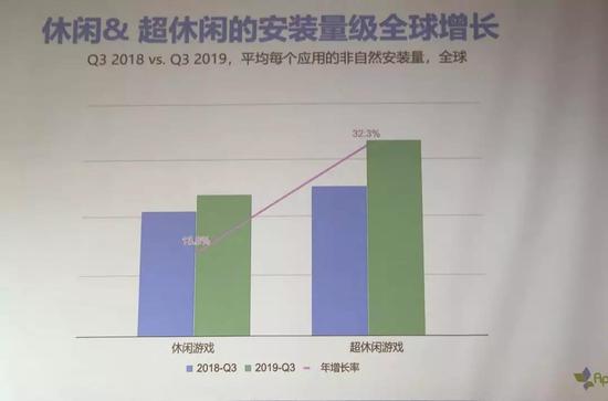 同比2018年Q3和2019年Q3,休闲类游戏整体都有不错的上涨,但是如果单独把超休闲的类别拆出来,就会发现促使这个行业上涨的主要来源是超休闲游戏的开发者们,他的增长率大概是3成,32%以上。相对而言传统意义的普通休闲类游戏增长率也有,但是可能要低很多。所以超休闲类游戏是我们今年发现的整个行业增长的引擎。