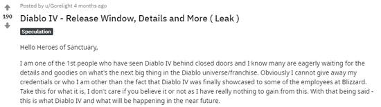 暴雪嘉年华2019上《暗黑破坏神4》的公布无疑让非常多期待本作的玩家兴奋不已。其实在4个月之前,就有一位名为Gorelight的用户在Reddit论坛上泄露了大量有关《暗黑破环神4》的消息。由于他的消息发布在《暗黑破坏神4》正式亮相前,其中的部分内容已经得到了暴雪证实,但还有很多尚未被官方所承认。