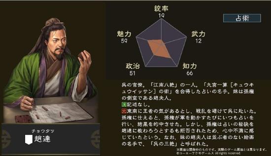 今天(11月12日)光荣特库摩公开了《三国志14》新武将赵达的人物介绍和五维图,赵达是一位看似洞晓天机的吴国官僚,他是位占卜名人,并因感受到东南方有王者之气而来到吴郡。