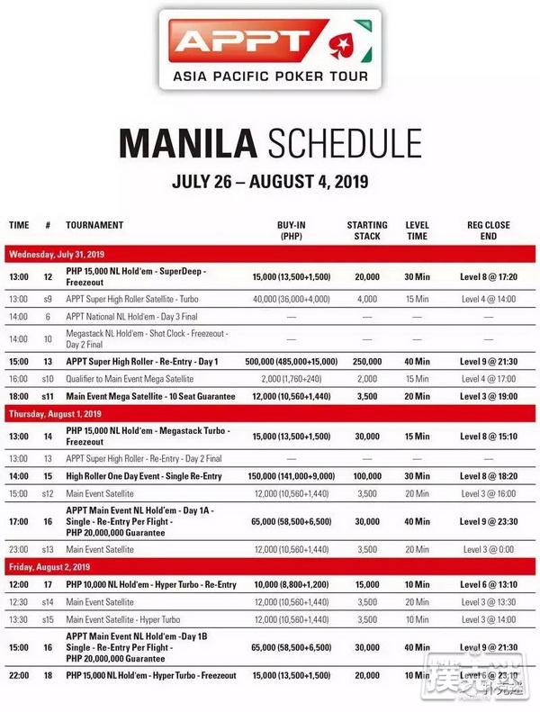 ●APPT马尼拉站主赛事:2019年8月1~4日 – ₱65,000比索 – ₱2,000万比索保底