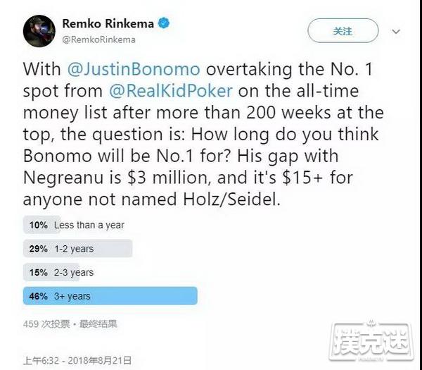 2018 WSOP百万一滴水之后Justin Bonomo直接问鼎全球扑克金钱榜,但他与之前的第一名大丹牛差距并不大,著名扑克主播Remko Rinkema日前就对Bonomo到底能在榜首位置呆多久之一话题进行了推特民意调查。