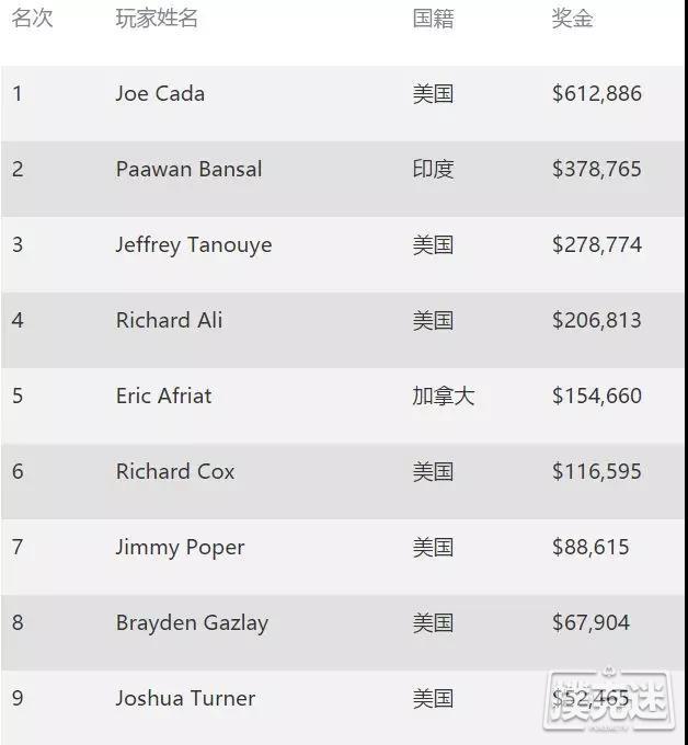 日前在WSOP主赛事中以第5名选手出局的Joe Cada成功拿下了WSOP第75项赛事 $1,500 The Closer无限德州扑克赛的冠军,收获个人第4条金手链。