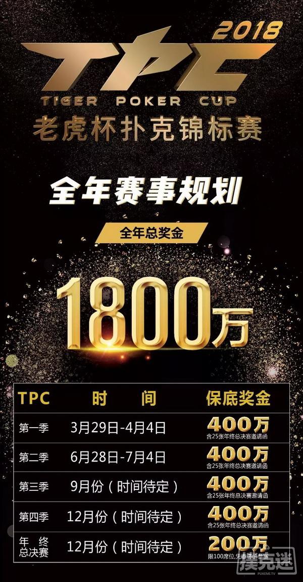 本次2018 TPC老虎杯第2季将于6月28日--7月4日期间举办,主赛事保底奖金400W旅游基金,包含25张年终总决赛邀请函!现已开启火热报名,届时众多的竞技扑克爱好者将在TPC的大舞台上同桌竞技互相切磋,以牌技一争高下!