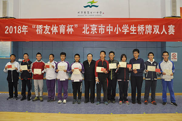 在北京桥牌协会的周密组织下,在各校广大师生和社会各界的积极参与和家长们的大力支持下,2018年“桥友体育杯”北京市中小学生桥牌双人赛圆满结束。