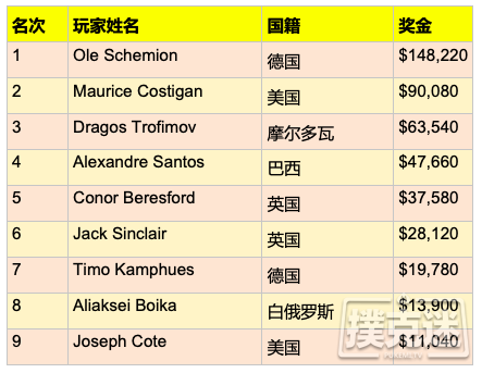 美国选手Maurice Costigan是比赛的亚军,季军是摩尔多瓦选手Dragos Trofimov,线上实力牌手Conor "1_conor_b_1" Beresford是此次的第5名,WSOP欧洲站主赛事冠军Jack Sinclair获得比赛第6名,第13届EPT马耳他主赛事冠军Aliaksei Boika是比赛的第8名。