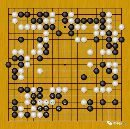 图2:由于陈耀烨此时全局实空领先并不多,所以面对白102的试应手,他没有退让的资本。黑103长在外面大吃白棋是局部最强手。
