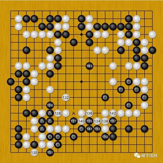 图12:面对陈耀烨黑127刺的妙手,申真谞选择白128双补连回三子,但黑129长后,由于白外围还是欠着A位冲的严厉手段,因此白132还得自补一手。