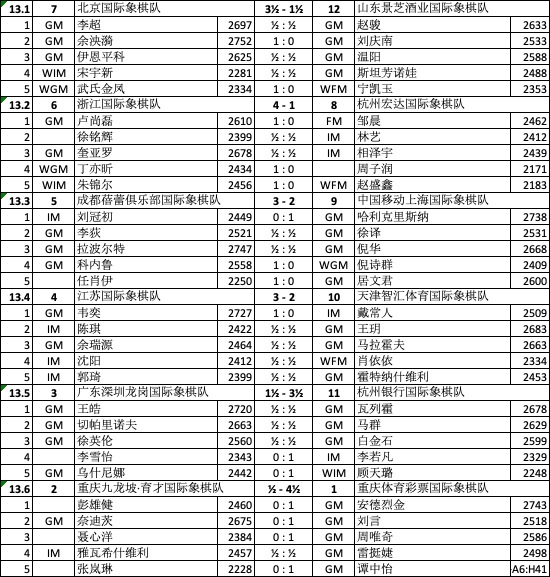 本轮焦点战当属领头羊中国移动上海队与成都蓓蕾俱乐部队的对决,上海队印度男外援哈利克里斯纳发挥依旧稳定,后手战胜刘冠初,其他两场新锐之战徐译弈和李荻,倪华后手顶和拉波尔特,女子方面倪诗群不敌印度名将科内鲁,双方此时打平,胜负交给了居文君与任肖依的对决,在时间紧张的情况下,现任棋后居文君出现失误,爆冷超时负于任肖依,上海队遗憾的以2比3输掉了比赛,但由于此前领先分数较多,目前上海队仍位居榜首。