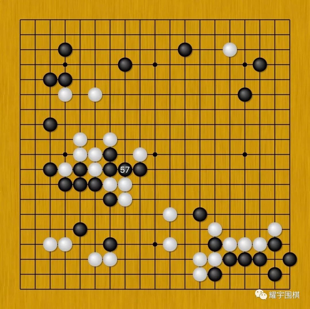这是申真谞在16强战中与陈耀烨之局的关键时刻,面对茫茫白阵,申真谞黑57孤军力战而出,之后在白阵中如若无人之境,扬长而去。一举确立胜势。