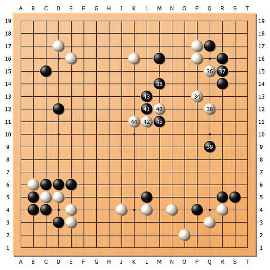 [图3]白40对黑棋进攻的时候,黑41到黑45积极地选择反击相当严厉。从这里感觉黑棋开始占据了主动。