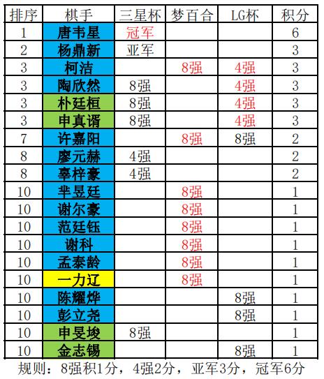 2018赛季最终积分表10月30日将进行LG杯半决赛的争夺,柯洁VS申真谞,陶欣然VS朴廷桓,这场对决非常关键,很可能将改变世界大赛积分榜上前几名的排位。期待中国棋手能更进一步。