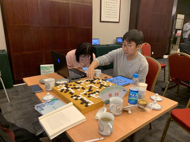 韩国研究席热闹起来另一边,韩国研究席人数逐渐多了起来,韩国代表团团长高光禄,女队教练睦镇硕与队员吴侑珍和曹承亚坐在一起,一边用笔记本跑着ELF,一边用ipad看着实战进程。