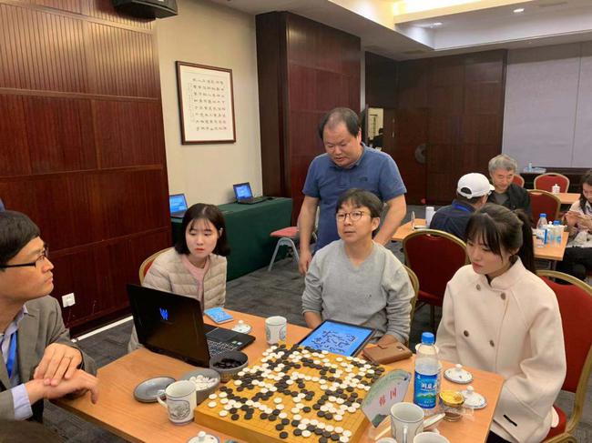 韩国研究席较为冷却这一局已无悬念,大家又回到中韩焦点战上来,此时小鱼儿局面不错,人工智能已判断白棋胜率超过80%。局面的胜率就像与研究席的氛围成正比一般,中国研究席热闹非凡,而旁边的韩国研究席只有女队教练睦镇硕与队员吴侑珍两人默默摆棋。