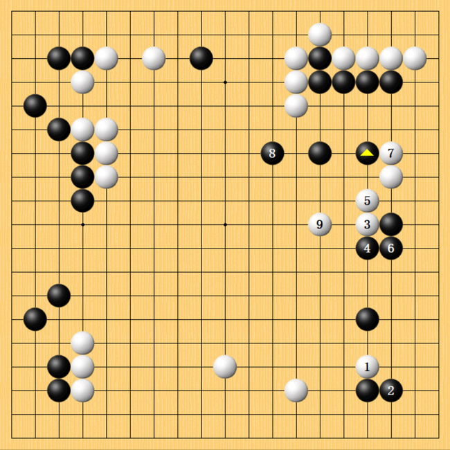 如图白棋一气压完四路后,回头白9贴住,崔精直接打入,白11紧紧紧逼,全局无弱棋并占据攻击主动权,胜率已稍稍占优。