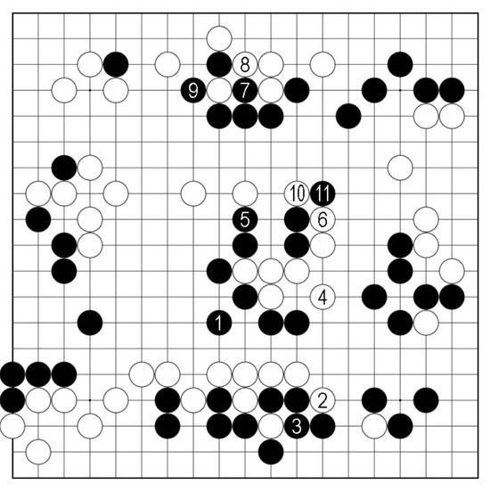 实战白棋1-5皆兑换先手权利,下方白7冲黑8粘上,白棋得以渡过,接着抢先11靠,占据主动。