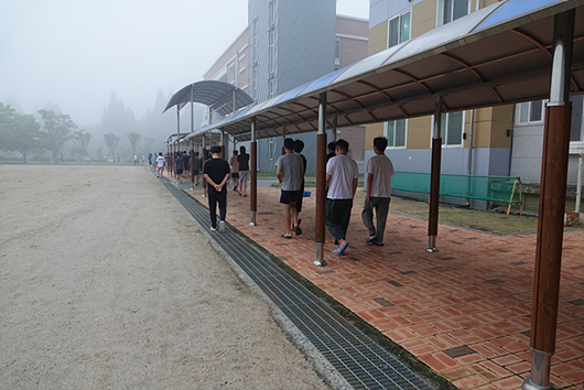 学生在音乐声中起床,到运动场点名。点名完毕,先绕运动场跑一圈,然后才能回到宿舍。
