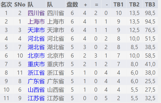 由许翔宇、赵元赫和任肖伊组成的四川省表现稳定而成熟,六轮过后分别和上海、北京打平,其他比赛均取得胜利。由白金石、徐译和倪诗群组成的上海队在今天的比赛中不敌天津队,稍显意外。