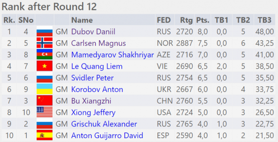 昨天的明星棋手是俄罗斯的杜波夫,6盘比赛3胜3和,还战胜并反超卡尔森,以8分的成绩高居榜首,卡尔森位居第二。