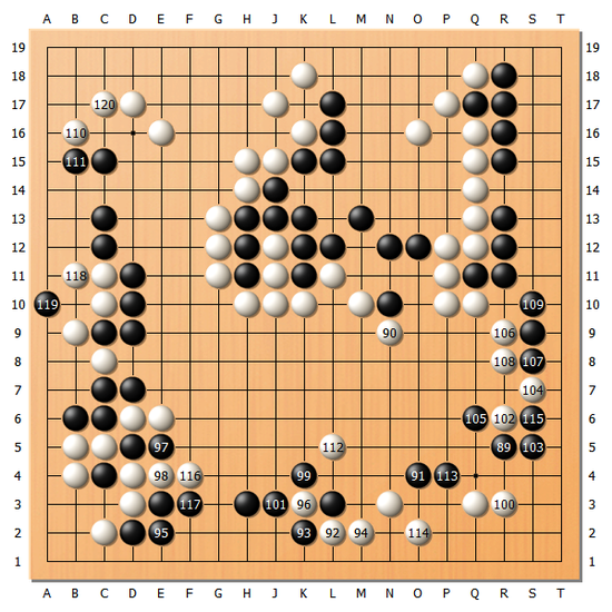 黑101的拔非常稳健,形势不利的白棋,此时白104的小尖是非常拼命的一手棋。但是黑109退之后,黑棋的联络已经不成问题了。白110的小飞很大,白112催促黑棋立马渡回,黑117看上去很小,但是下方的味道并不好,这也能看出秀和稳健的棋风。