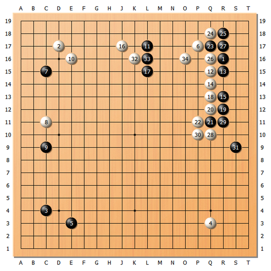 黑23稳健守角,行至黑31安定了右边的黑棋,虽然幻庵因硕依旧保持连贯的进攻,但是这盘棋的布局,应该是进入了秀和的节奏。