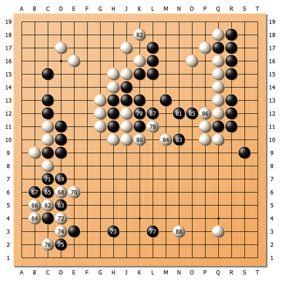 [图5]黑棋不希望白棋在左边轻松活棋,选择了强攻。行至黑77战斗告一段落。虽然黑棋也不能说占得了便宜,但是有效地控制了白棋的厚势,局面也变得清晰起来。