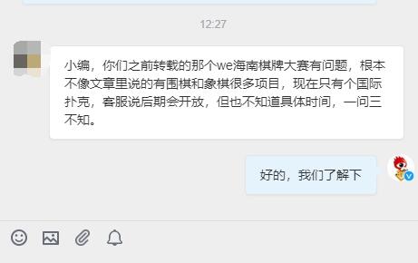 不久前,新浪棋牌曾转载了一篇人民网发布的《2020年“WE海南全民棋牌大赛”在海口正式启动》消息,本以为是又是一项全国性的线上智力运动大赛,谁知近日却接到网友举报,这项比赛涉嫌虚报项目,赛程不明,有些不正规。