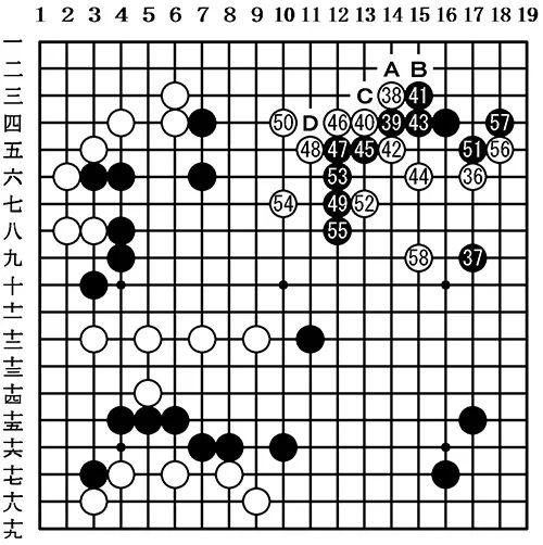 白50张栩的威严。这个棋型,之后白A、黑B之后,今后黑棋有C位断的手段。所以一般情况下,白50会在D位粘上。那么张栩究竟是看到了什么变化呢?