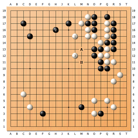 [图12]黑99的试应手很妙,保留了角上的味道,黑101回到中央,这里黑棋的节奏掌控得很不错。行至黑107,白棋之后有A位托和B位顶的手段,但是对白棋来说这盘棋已经不好下了。