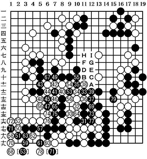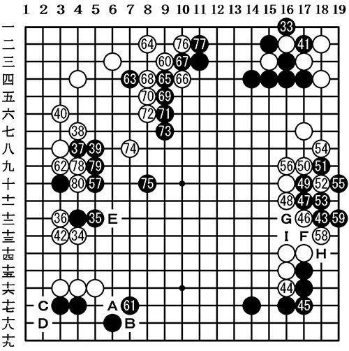 右边的黑43是黑棋瞄准好的一手棋。黑49这手棋可以提醒辻笃仁的计算深度。一般情况下,黑F、白G、黑H、白I、黑58位交换之后,白棋抢到白57位的急所,这样的话黑棋无趣。