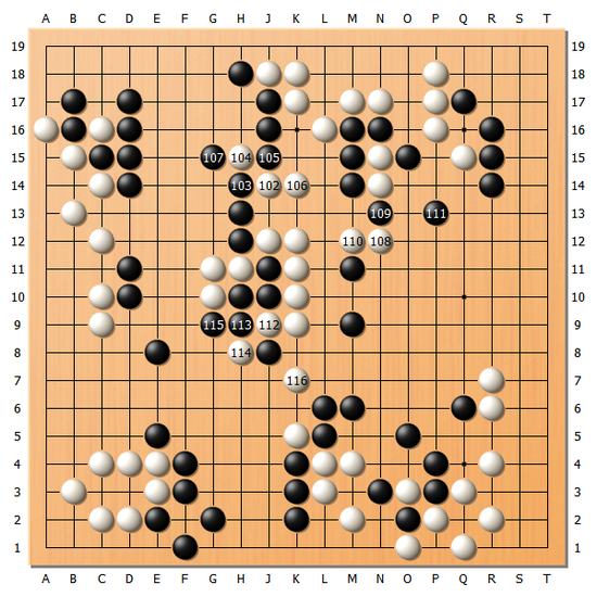 [图8]白102跳出之后,白108穿出,这盘棋彻底说不清孰好孰坏了。行至白116,这盘棋就此进入收官局面。
