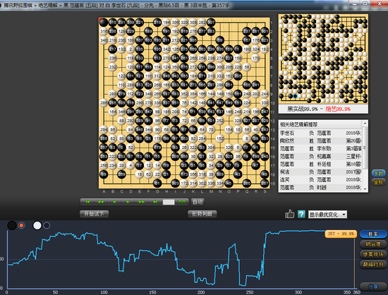 9月的首轮小组赛胜者组,他与韩国天王李世石相遇,这是一盘长达357手的大热战。双方胜率跌宕,几度反转,劫争不断,多块大棋死而复生,生又转死,沧海桑田。最后时刻,范蕴若弈出李世石的盲点黑269,净杀左下角而过关。此后,范蕴若10月连过申真谞、朴廷桓两关,三代韩国第一人被他以一己之力拉下马来,且都是内容充实的好局。