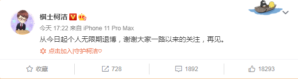 7月5日下午,柯洁在个人微博中宣布退出微博,并配文称:“从今日起个人无限期退博,谢谢大家一路以来的关注,再见。”