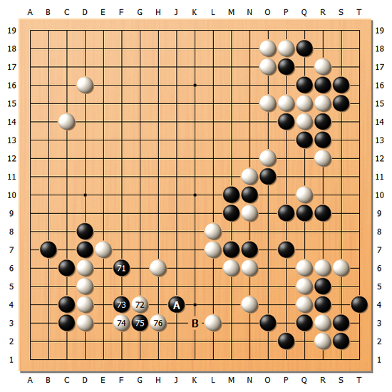 [图6]但是封手黑71和白72交换之后,A位的打入就显得并不成功。行至白76黑棋没有合适的手段,或许在B位尖顶一手考虑局部做活会好一点。
