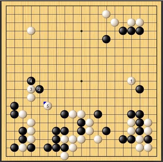 图5:白1大飞步子有些大,黑2直接跨断,白棋中央一队危在旦夕。实战虽然形成转换,明显黑棋中央所得更大。不过柯洁还“得理不饶人”,黑6刺,既攻击左边白棋大龙,又收住了中央大空,惬意无比。