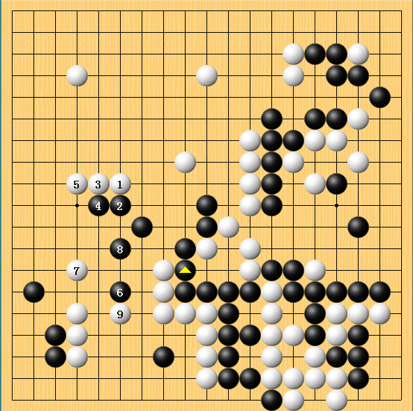 白1、3连续侵入右上,柯洁黑4团防御扎实,却又充满杀气。