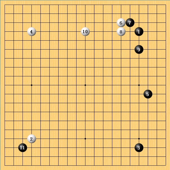 终盘前的局面如图。黑棋简单应对,如一脉浅溪顺道流入上方,雪白的冰城堡垒立即生枝发叶,春暖花开,转为黑色土地。至黑11跳补,白已无力杀棋,而右上白一队更无生路,已然大败。自此金志锡无奈投子。