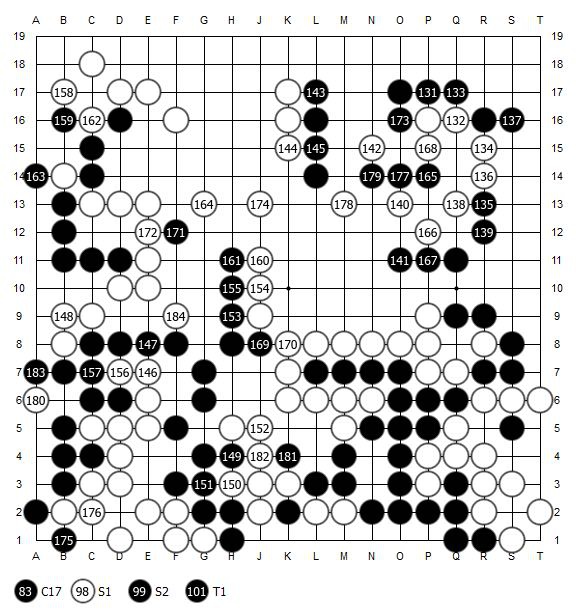 实战白棋补棋前先冲了一手,这次交换也间接改变了未来左下黑棋的命运。交换以后黑棋左下依然没有安定,于是黑153、155长出,而白方借此抢到了白158的大官子。黑方眼见实地不足,不再退让,第165手点入威胁右上白棋。白方在局部没能找到就地做活之术,下出了第174手,意欲左侧杀黑与右侧连回见合。黑方在第175手打将后决定强杀右侧,黑179手更是无声地表达了自己不再退让的决心。此时,白方也只剩下了唯一选择,下出白180、184两手漂亮的组合拳击溃了黑棋,其中根据对局双方在对局结束后的对话可知,Andreas Goetzfried先生也没有注意到白184的手段。在白180落下时,星阵与katago都认为此处黑棋已经无力回天,但从业余棋手的角度来看,白184下完后,黑方依然可以尝试杀出重围,不过黑方很有风度地选择了直接认输。