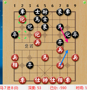 交兑下来,几度转换,红成车马兵双相,黑成车炮士象全,红方车马在前,有过河兵相助,黑车炮极力进攻。