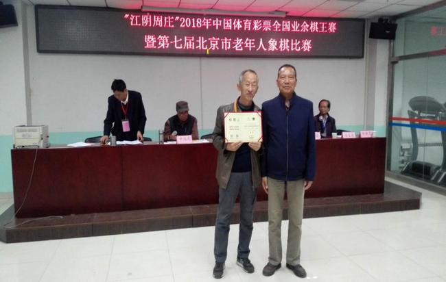 颁奖现场本次比赛设团体赛、个人赛,设金银铜奖。经过两天的比赛,来自房山区燕华星城棋友队孙广辉获得“江阴周庄”2018中国体育彩票全国业余棋王赛北京赛区老年人组冠军并获得棋王证书。