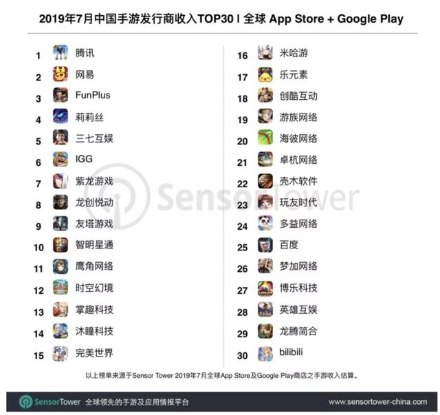 PingWest品玩8月7日讯,Sensor Tower 商店情报平台显示,2019年7月中国手游发行商在全球 App Store 和 Google Play 的收入排名。榜单中30个手游发行商7月全球吸金超过14.2亿美元,拿下当期全球手游总收入27%的市场份额。