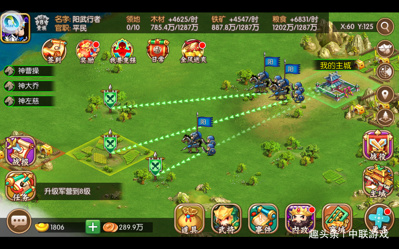 这款游戏去掉了率土里面很浪费时间的铺路玩法,率土之所以肝是因为很多时间都消耗在路上。因为萌军天下里面我们占地不需要一块挨着一块的,再远了可以建要塞或干脆直接迁城过去。