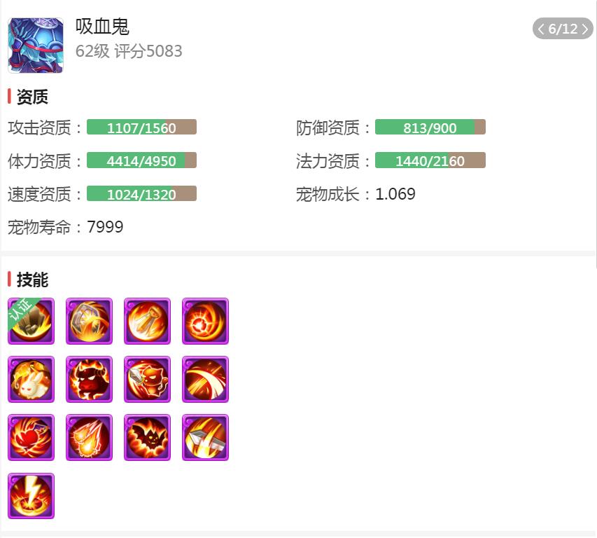 这代表这只吸血鬼被主人当作了法宠来培养。但由于认证后便不能合宠,所以一般都会在技能栏、资质都达到期待的情况下认证。这只宠物技能栏已经达到了13技能,但是在资质方面却并不是很好,在同样13技能的吸血鬼中,并不能算顶尖的。特别是其法力资质只有1300多。在同样13技能红宠中,便显得有些鸡肋。