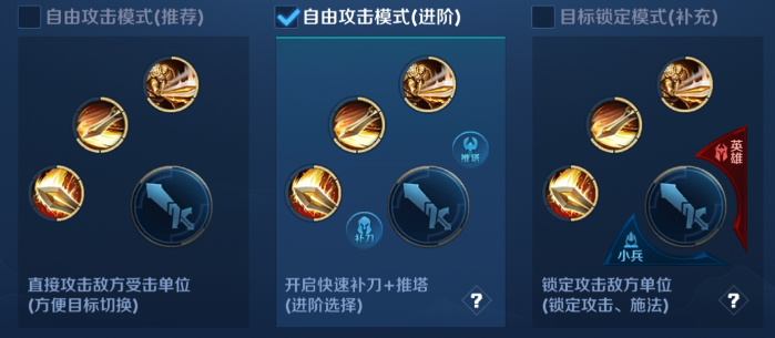 这个模式是游戏最基础的模式,一般不改动默认就是它。它的特点是在同一攻击范围优先攻击英雄,然后是防御塔,最后是小兵。不能说这个模式不好,它确实方便实用。并且很容易上手,但缺点也是明显的,比如推塔的时候如果范围内有英雄那么就会攻击到英雄,或者是小兵上。