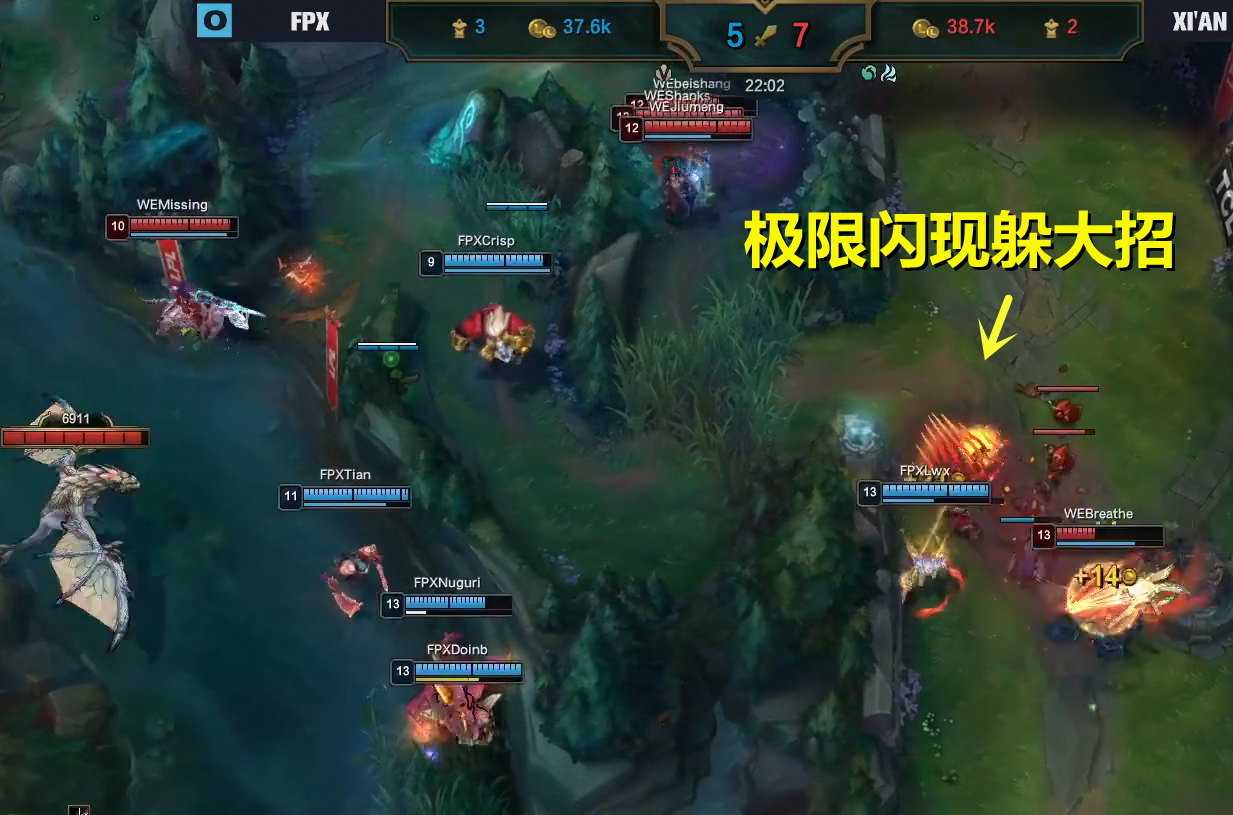 LWX极限闪现躲刀妹大招的这一波名场面操作是发生在FPX和WE的第一场对决中,当时FPX是处于劣势,而WE在有优势的情况下想要拿到“听牌龙”,如果让WE拿到这条小龙,FPX就会很被动。