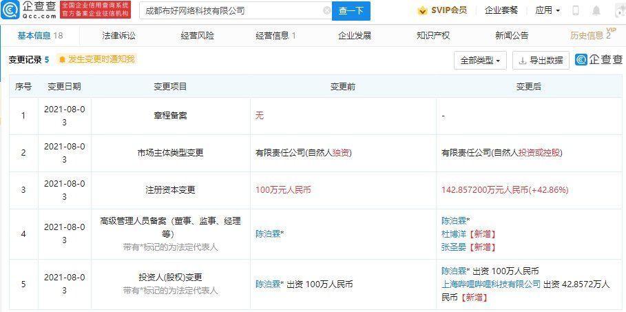 企查查APP显示,8月3日,成都布好网络科技有限公司发生工商变更,新增B站关联公司上海哔哩哔哩科技有限公司为股东,同时公司注册资本由100万元人民币增加至142.86万元人民币,增幅为42.86%。