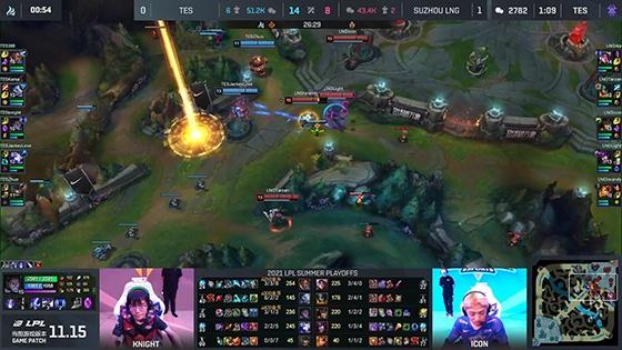 TES vs LNG的第二局第26分钟,TES击杀大龙后三路分推齐头并进,JackeyLove的艾希在侧翼塔姆的掩护下孤身一人在中路大摇大摆地清线,LNG尝试包夹艾希,蕾欧娜先手预判的大招落空,艾希攒出Q技能减速蕾欧娜后又躲开其E技能,开大的奥拉夫一发Q斧头也被扭开,随后艾希用净化解掉辛德拉的E推球,塔姆及时赶来吃下艾希,规避了辛德拉大招的伤害,TES见LNG方浪费了三个大招直接集结中路,反打出1换5团灭LNG追平了比分。